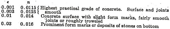 Since civil engineers usually classify surface roughness by the Kutter and Manning roughness factor n, it would be helpful in selecting a value of e for such variable surfaces as concrete, if we could correlate e and n. P. Panagos6 has applied the Colebrook function to the test data collected by Scobey (16) and finds the following values of e corresponding to the Rutter n ratings given by Scobey, which may be at least tentatively utilized: