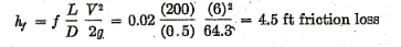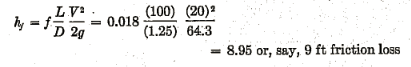 Example 1: To estimate the loss of head in 200 ft of 6-in. asphalted cast-iron pipe carrying water with a mean velocity of 6 fps: In Fig. 2, for 6 in. diam (bottom. scale), the diagonal for « asphalted cast iron » gives e/D= 0.0008 (left-hand margin). In Fig. 3, for 6 in. diam (left-hand margin), the diagonal for V = 6 fps gives R = 2.5 (105) (bottom scale) (or, instead of using Fig. 3, compute VD » = 6 X 6 = 36). In Fig. 1, locate from the right-hand margin the curve for e/D= 0.0008 and follow this curve to a point above R = 2.5 (105) on the bottom scale (or below VD » = 36 on the top scale). This point gives f = 0.02 (left-hand margin); then: