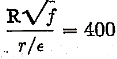 Example 2: To estimate the loss of head per 100 ft in a 15-in. new cast-iron pipe, carrying water with a mean velocity of 20 fps: In Fig. 2, for 15 in. dim (bottom scale), the diagonal for « cast iron » gives e/D= 0.0007 (left-hand margin). In Fig. 3, for 15 in. diam (left-hand margin), the diagonal for V = 20 fps gives R = 2 (106) (or, instead of using Fig. 3, compute VD »= 20 X 15= 300). In Fig. 1, the curve for e/D= 0.0007 (interpolating between 0.0006 and 0.0008, right-hand margin), at a point above R = 2 (106) (bottom scale) (or below VD » = 300, top scale) gives f = 0.018 (left-hand margin). In this case the point on Fig. 1 falls just on the boundary of the region of « complete turbulence; rough pipes. » Here R or VD » need only be approximated sufficiently to see that the point falls in the complete turbulence region, and f can then be found directly from the right-hand margin in Fig. 2 without further reference to Fig. 1; then