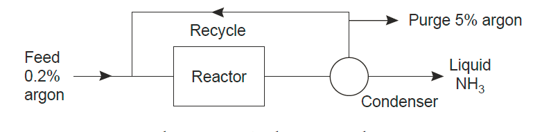 Dans la production d’ammoniac à partir d’hydrogène et d’azote, la conversion, basée sur l’une ou l’autre des matières premières, est limitée à 15%. L’ammoniac produit est condensé à partir du courant produit du réacteur (convertisseur) et les réactifs n’ayant pas réagi sont recyclés. Si l’alimentation contient 0,2% d’argon (provenant du procédé de séparation de l’azote), calculez le taux de purge requis pour contenir l’argon dans le flux de recyclage à 5,0%. Les pourcentages sont en volume.