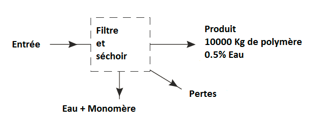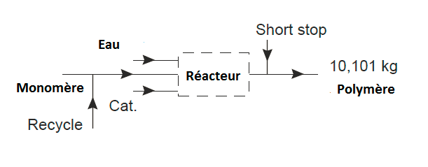 Le diagramme montre les principales étapes d’un procédé de production d’un polymère. À partir des données suivantes, calculez les débits pour un débit de production de 10 000 kg / h.