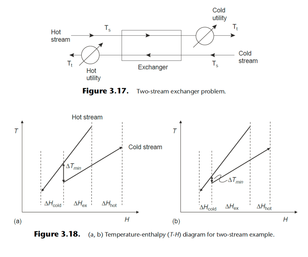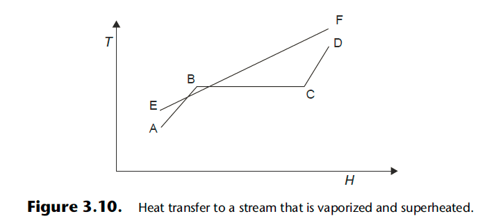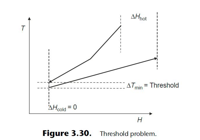 Les problèmes qui montrent la caractéristique de ne nécessiter qu’un service public chaud ou un service public froid (mais pas les deux) sur une plage de différences de température minimales, de zéro à une valeur seuil, sont appelés problèmes de seuil. Un problème de seuil est illustré à la figure 3.30.