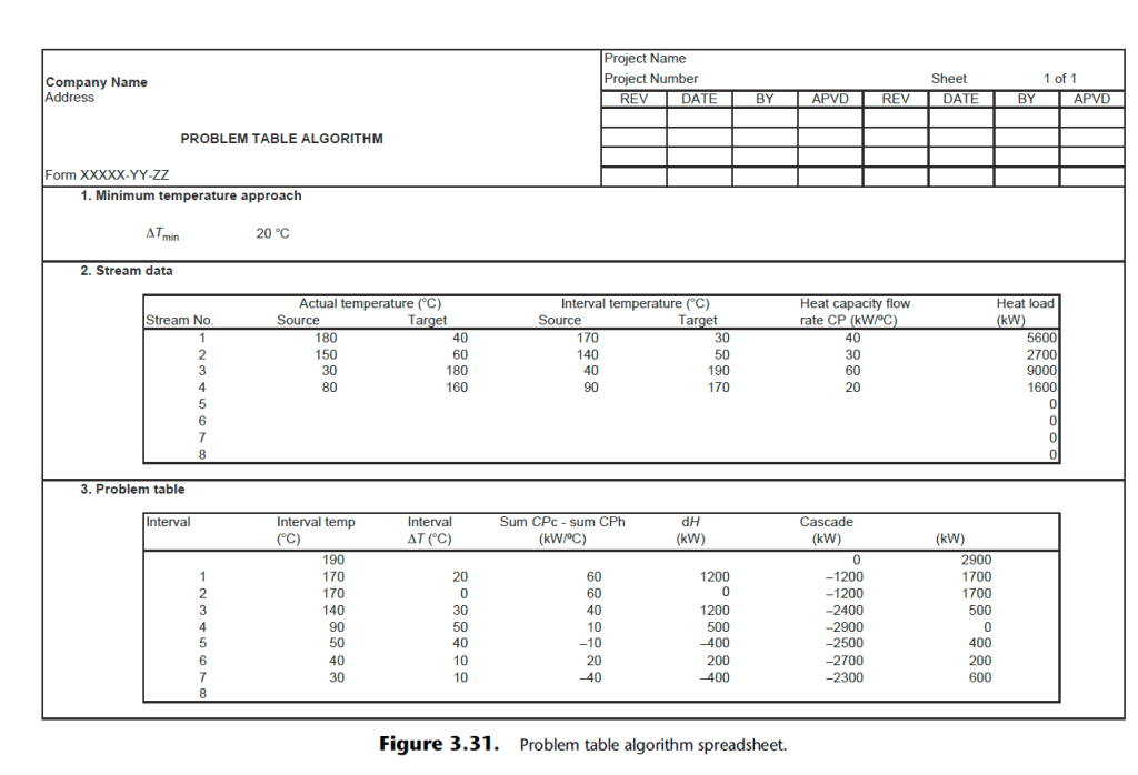 Le tableau des problèmes pour trouver les exigences minimales en matière d’utilité et la température de pincement peut être intégré dans une feuille de calcul. Les calculs dans chaque cellule sont répétitifs et la formule peut être copiée de cellule en cellule à l’aide des commandes de copie de cellule. Un modèle de feuille de calcul pour l’algorithme de la table des problèmes est disponible au format MS Excel dans le matériel en ligne à l’adresse http://books.elsevier.com/companions. L’utilisation de la feuille de calcul est illustrée à la figure 3.31 et décrite ici.