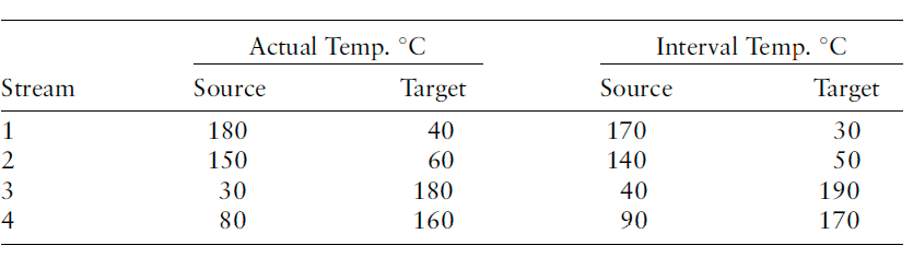 Déterminer les températures de pincement et les exigences minimales d’utilité pour les flux indiqués dans le tableau suivant, pour une différence de température minimale entre les flux de 20 ° C. Concevoir un réseau d’échangeurs de chaleur pour obtenir une récupération d’énergie maximale.