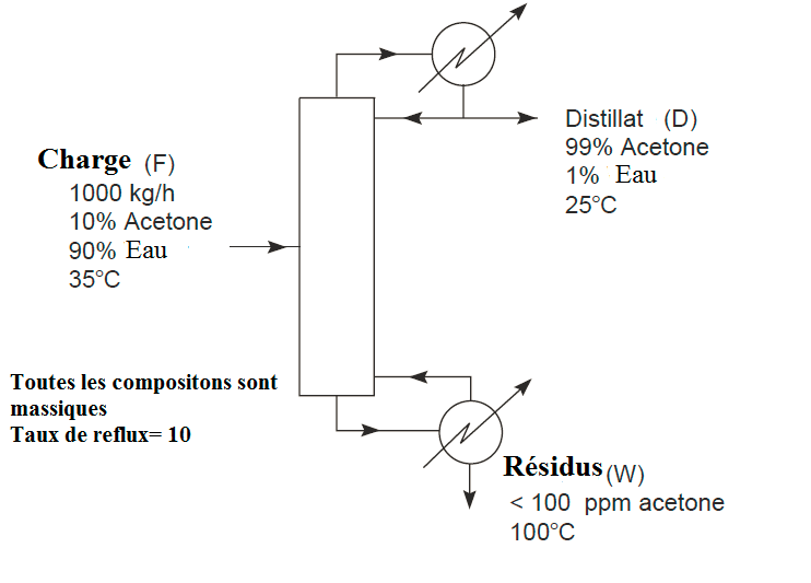 Bilan sans réaction chimique. Estimez la vapeur et l’eau de refroidissement nécessaires pour la colonne de distillation représentée sur la figure.