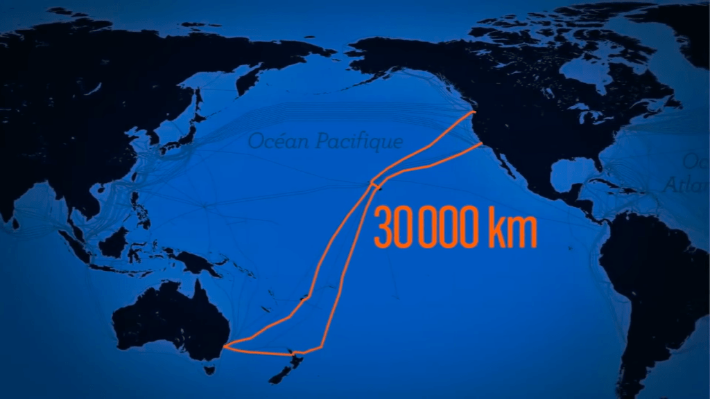Long de 6400 km, ce câble en fibre optique peut transporter 160 terra bits de données par seconde soit les trois quarts du trafic internet actuel, c’est le plus puissant des 428 câbles qui connectent aujourd’hui le monde.