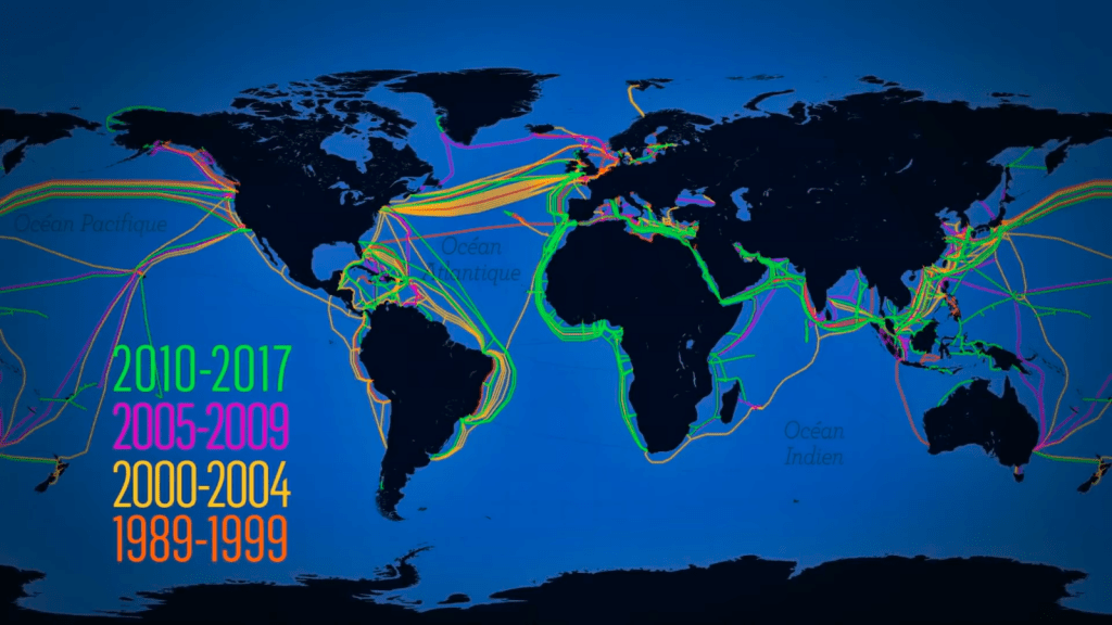 Aujourd’hui, plus de 1,3 million de kilomètres de câbles traversent nos océans soit 32 fois le tour de la terre. Il y a eu un premier pic de pose de câbles lors de la bulle internet des années 2000 et un deuxième actuellement.