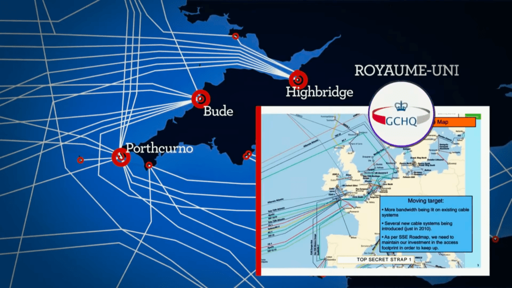 Exemple au royaume uni où les trois points principaux Porthcurno, Bude, Highbridge permettent l’écoute par les services britanniques de nombreux câbles transatlantiques comme l’indique cette carte des services secrets tirées des archives de Snowdon.