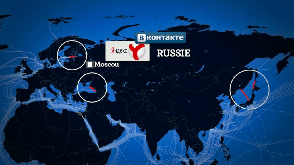 Face à cette hégémonie américaine, la Russie elle est relativement à l’abri; seuls quatre câbles internationaux la relient au reste du monde, l’un avec la Finlande, un autre avec la Géorgie et deux avec le Japon.