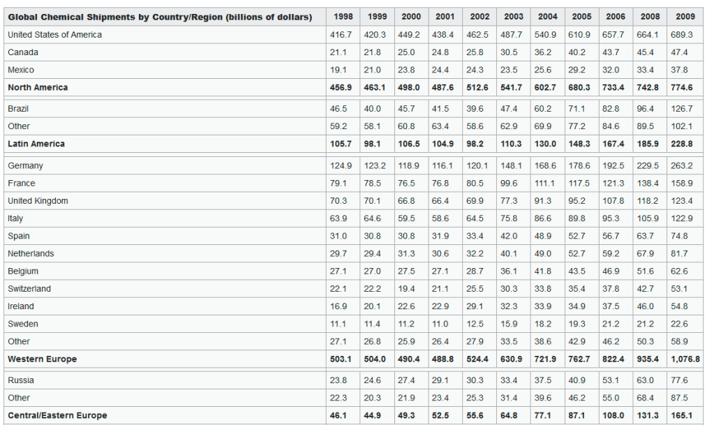 Au cours de ce siècle, les entreprises de l’industrie chimique comprennent de grandes, moyennes et petites entreprises situées partout dans le monde. Les entreprises ont augmenté leurs ventes de produits chimiques et de nombreuses entreprises ont réalisé des ventes supérieures à 10 milliards de dollars et pour certaines de ces entreprises, les ventes de produits chimiques ne représentaient qu’une partie de leurs ventes totales. L’industrie chimique a établi son importance dans les économies nationales et a atteint environ 3,7 billions de dollars de ventes. Des millions de personnes ont été employées par l’industrie chimique dans la production, la recherche et le développement, ainsi que des chimistes, des ingénieurs et des techniciens. Bien que l’industrie de la chimie ait une portée mondiale, la majeure partie de la production chimique mondiale de 3,7 billions de dollars n’est représentée que par une poignée de pays industrialisés. Les États-Unis ont produit à eux seuls 689 milliards de dollars, soit 18,6 % de la production chimique mondiale totale en 2008.!