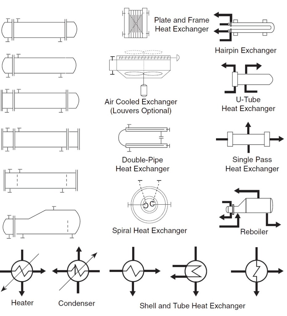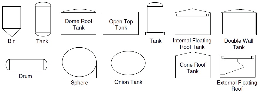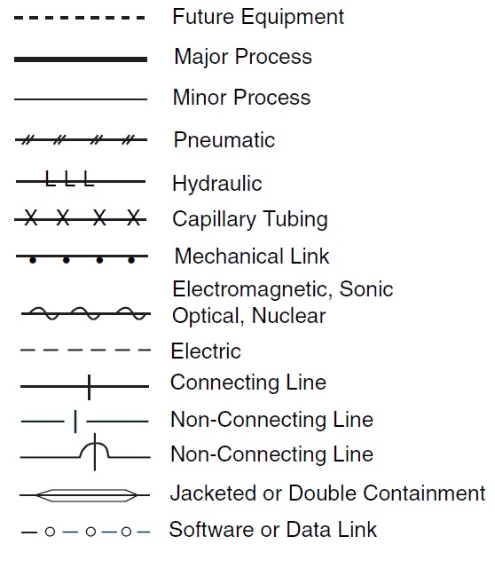 In Table table above, the “main process” refers to a pipe carrying a chemical. “Insulated” is straightforward, showing that the pipe has insulation. “Trace heated” shows that the pipe has wiring wrapped around it to keep the contents heated. “Lagged” indicates on a P&ID that the pipe is wrapped in a cloth or fiberglass wrap as an alternative to painting to improve the appearance of the pipe. The last column in the Table shows pipes that are controlled by a controller. “Electrical impulse” shows that the manner in which information is sent from the controller to the the pipe is by an electrical signal, whereas “pneumatic impulse” indicates information sent by a gas.