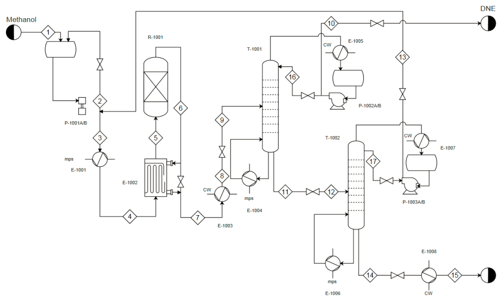 For example in stream 39 in Figure above, the pipe has a 4″ diameter, services/carries the chemical denoted ‘N’, is made of carbon steel, and has no insulation.