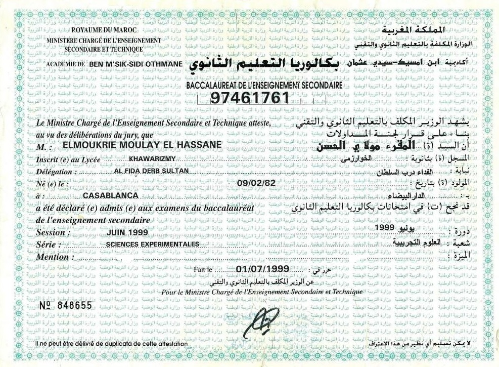 1999-2000 : Baccalauréat de l’enseignement secondaire.