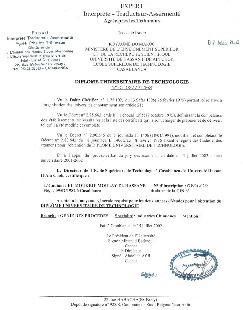 Spécialité : Industries Chimiques. École Supérieure de Technologie de Casablanca ESTC (Maroc)