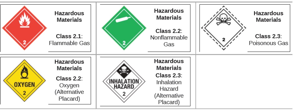 | Gases which are compressed, liquefied or dissolved under pressure as detailed below. Some gases have subsidiary risk classes; poisonous or corrosive.2.1 Flammable Gas: Gases which ignite on contact with an ignition source, such as acetylene, hydrogen, and propane.2.2 Non-Flammable Gases: Gases which are neither flammable nor poisonous. Includes the cryogenic gases/liquids (temperatures of below -100 °C) used for cryopreservation and rocket fuels, such as nitrogen, neon, and carbon dioxide.2.3 Poisonous Gases: Gases liable to cause death or serious injury to human health if inhaled; examples are fluorine, chlorine, and hydrogen cyanide. |