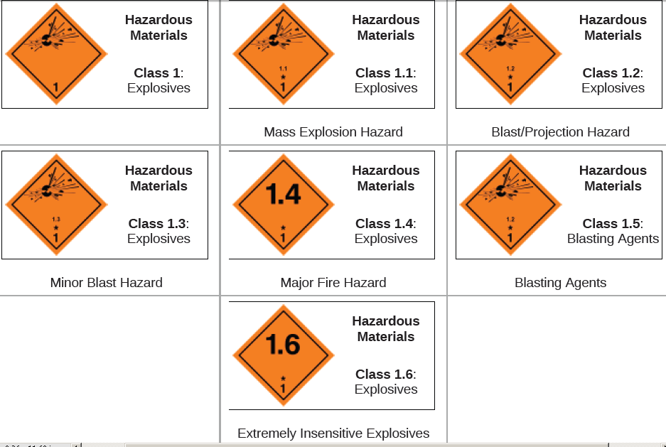 | Information on this graphic changes depending on which, « Division » of explosive is shipped. Explosive Dangerous Goods have compatibility group letters assigned to facilitate segregation during transport. The letters used range from A to S excluding the letters I, M, O, P, Q and R. The example above shows an explosive with a compatibility group « A » (shown as 1.1A). The actual letter shown would depend on the specific properties of the substance being transported.For example, the Canadian Transportation of Dangerous Goods Regulations provides a description of compatibility groups.1.1 Explosives with a mass explosion hazardEx: TNT, dynamite, nitroglycerine.1.2 Explosives with a severe projection hazard.1.3 Explosives with a fire, blast or projection hazard but not a mass explosion hazard.1.4 Minor fire or projection hazard (includes ammunition and most consumer fireworks).1.5 An insensitive substance with a mass explosion hazard (explosion similar to 1.1)1.6 Extremely insensitive articles.The United States Department of Transportation (DOT) regulates hazmat transportation within the territory of the US.1.1 — Explosives with a mass explosion hazard. (nitroglycerin/dynamite, ANFO)1.2 — Explosives with a blast/projection hazard.1.3 — Explosives with a minor blast hazard. (rocket propellant, display fireworks)1.4 — Explosives with a major fire hazard. (consumer fireworks, ammunition)1.5 — Blasting agents.1.6 — Extremely insensitive explosives. |