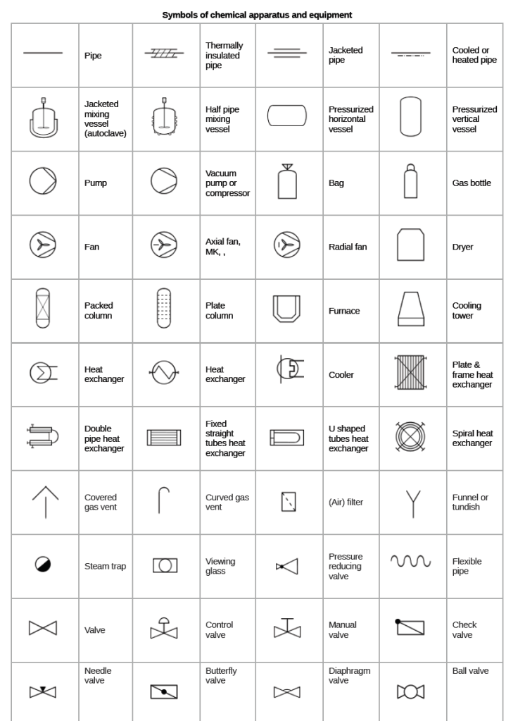 Below are listed some symbols of chemical apparatus and equipment normally used in a P&ID, according to ISO 10628 and ISO 14617.